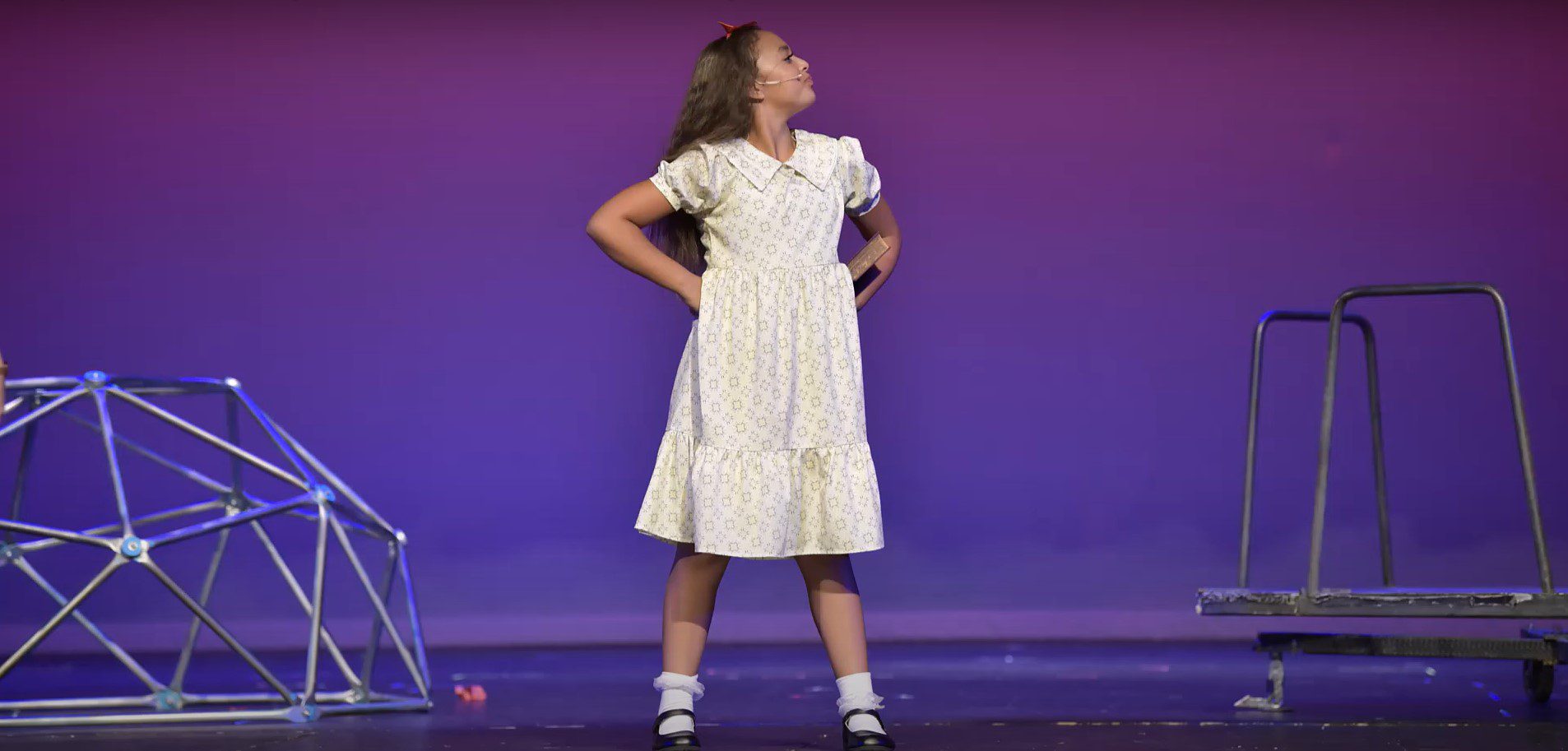 It might sound like hyperbole, but the set design by Perry Ewell was professional-level quality. Not only were there a lot of complicated sets, but they were also moved on and off the stage seamlessly. The school and playground sets were particularly impressive (they had the desks all connected to each other so they could move them out with ease). The Wormwoods’ house, Miss Honey’s house, the car dealership, and library were all well done.