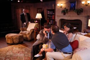 Director Ben Cummins, who most recently directed a strong production of Moon Over Buffalo at the Covey, understands this piece through and through, sticking to his very playful style of directing that brings the most out of the characters and the space. Set designer Spencer Powell expertly works in the intimate, thrust black box setting. The audience immediately feels immersed in the lifestyles of these characters, seeing up close their amenities, furniture, portraits, and of course the fine scotch. Cummins does an excellent job of having the characters utilize the space and really take advantage of the physical comedy opportunities that don’t directly appear on the page.