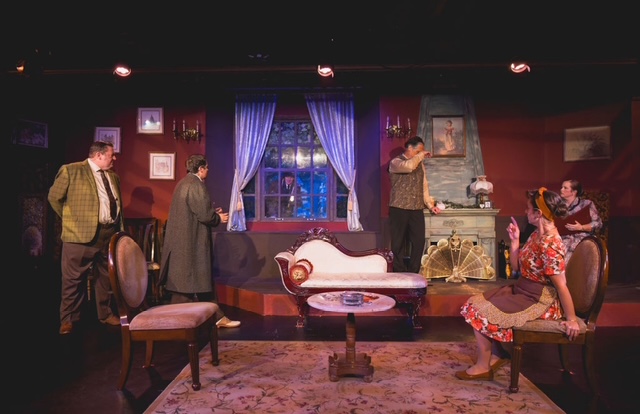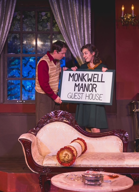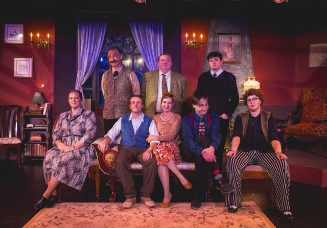 Lehi Arts Council’s production hosts a small space, but I was very impressed with how Set Designer Garrett Roblyer and Props Designer Elaina Lanier created not only a quaint guesthouse, but also a room set up with clear entrances and exits leading to different parts of the manor, provided seating for all, creative windows, as well as enough open space to move. This warm guesthouse shows the time period, makes logical sense, and does not feel claustrophobic or cluttered.