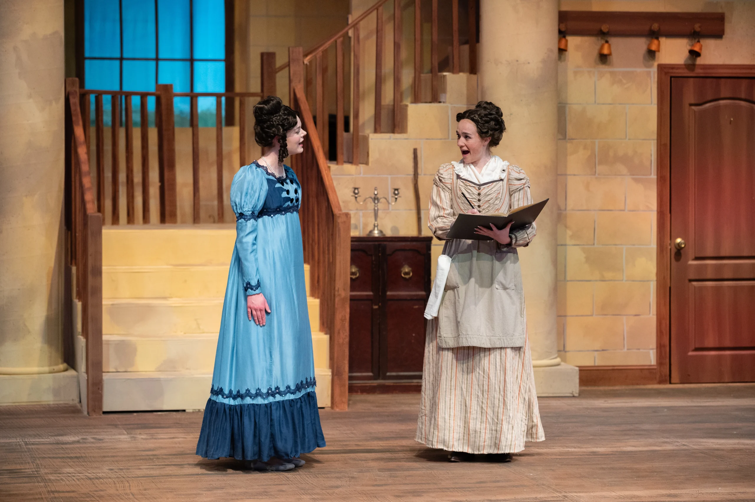 Grace Lynn Owen as Elizabeth Darcy and Ariana Whatcott as Mrs. Reynolds in The Wickhams: Christmas at Pemberley playing in the Morgan Theater at Utah State University. Photo Credit: Dycie Jo Photography.