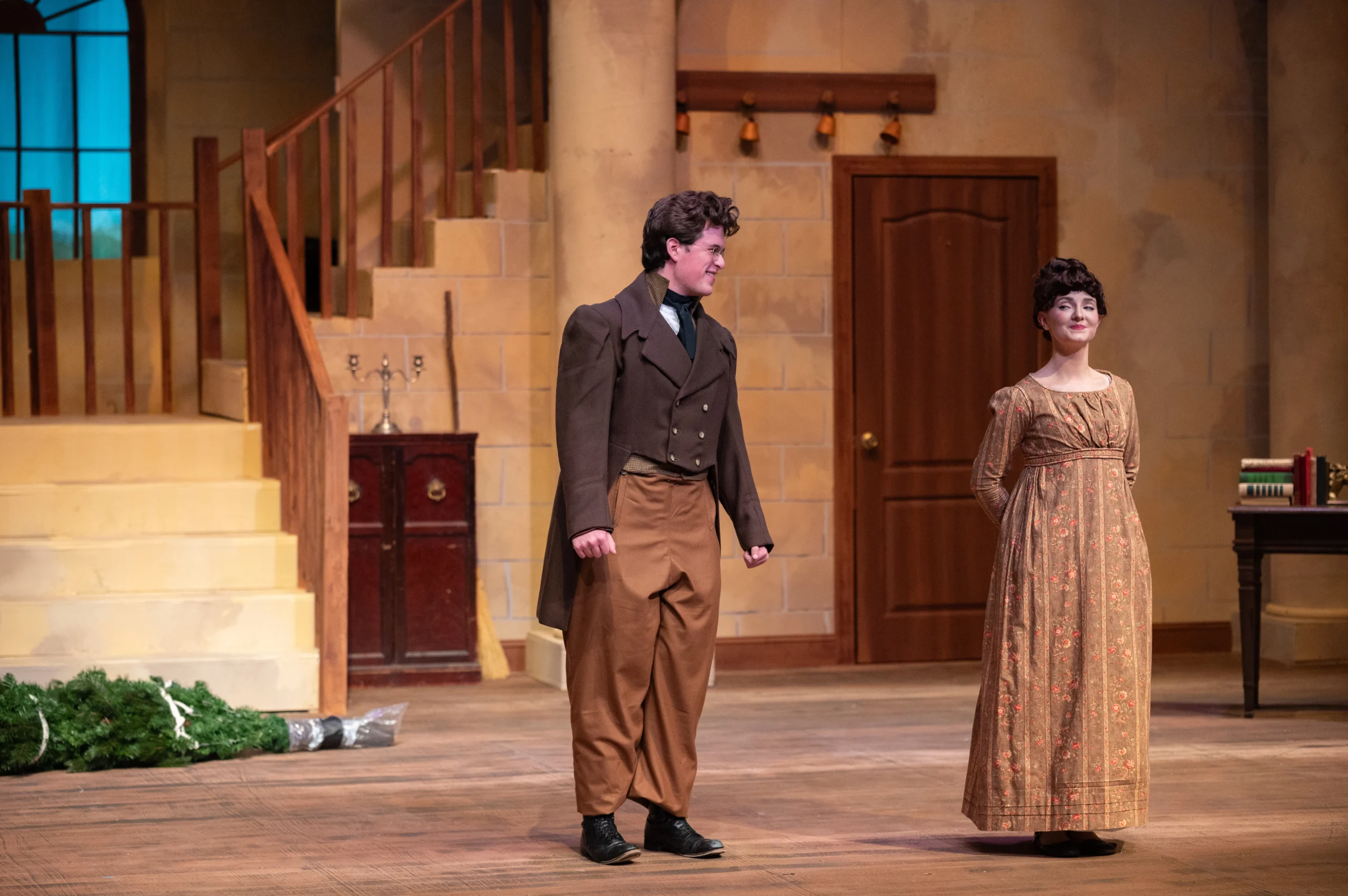 Cache Despain as Brian and Esther (Es) Barnes as Cassie in The Wickhams: Christmas at Pemberley playing in the Morgan Theater at Utah State University. Photo Credit: Dycie Jo Photography.