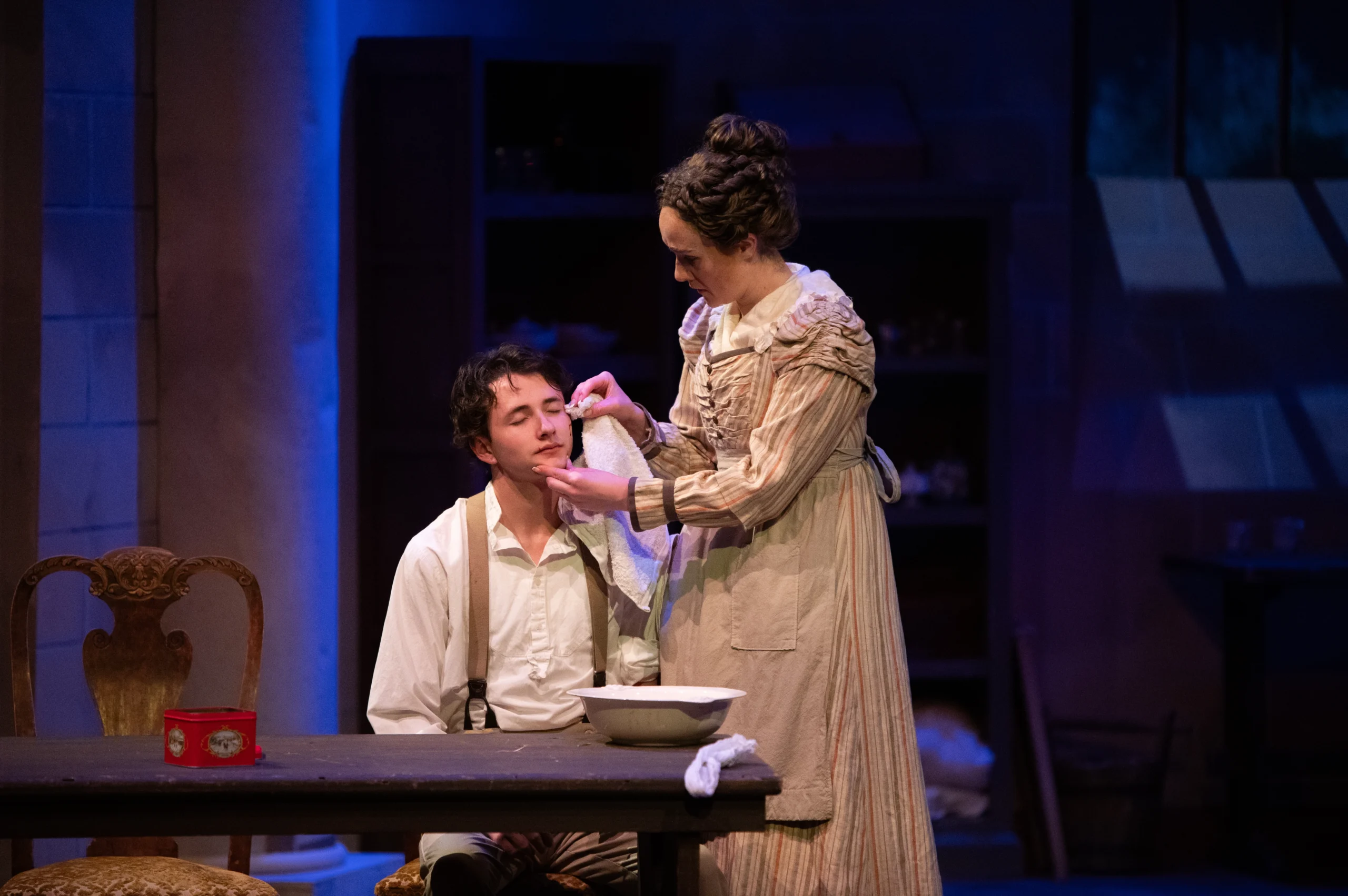 Niko Barlow as George Wickham and Ariana Whatcott as Mrs. Reynolds in The Wickhams: Christmas at Pemberley playing in the Morgan Theater at Utah State University. Photo Credit: Dycie Jo Photography.