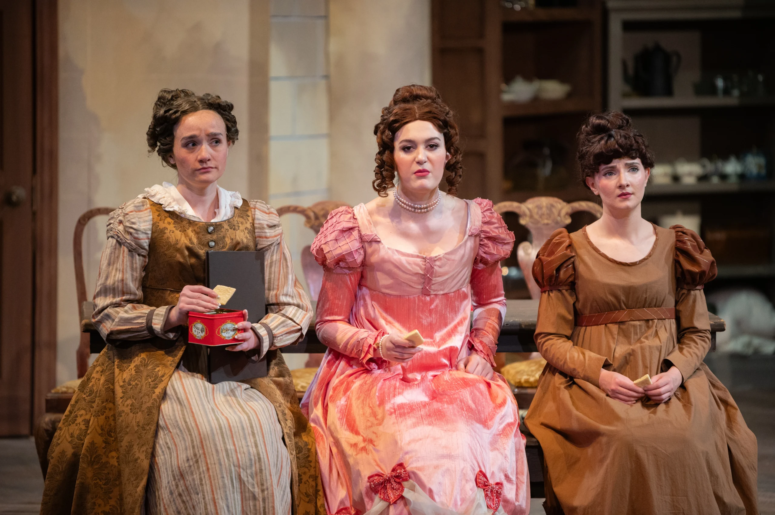 Ariana Whatcott as Mrs. Reynolds, Emily Alvey Despain as Lydia Wickham, and Esther (Es) Barnes as Cassie in The Wickhams: Christmas at Pemberley playing in the Morgan Theater at Utah State University through November 21st, 2025. Photo Credit: Dycie Jo Photography.