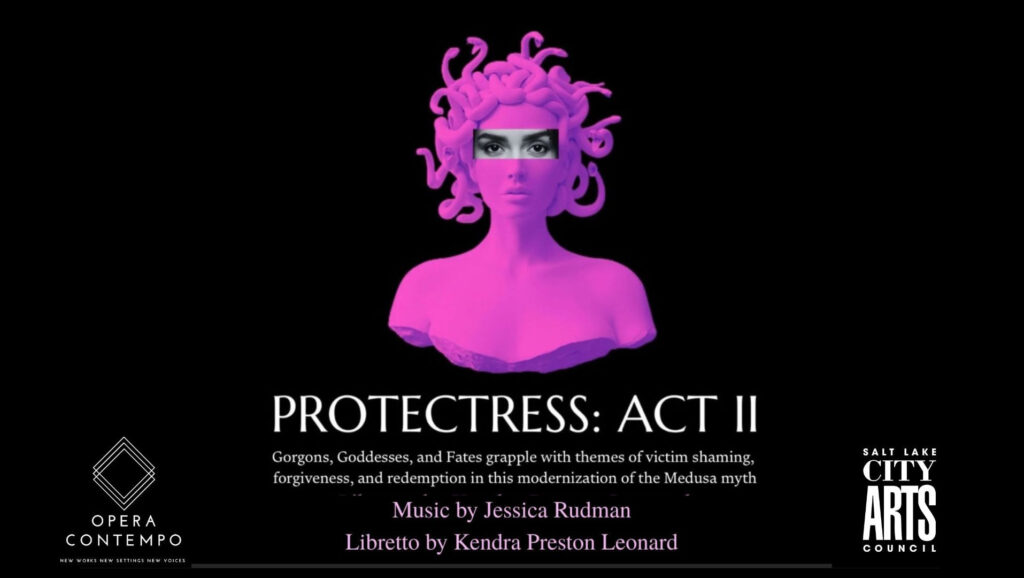 Opera Contempo’s latest project is a semi-staged, score-in-hand, reading of Act 2 of a new opera, Protectress, by local composer Jessica Rudman and librettist Kendra Preston Leonard. The final dress rehearsal took place Thursday, November 20, 2025, in the University of Utah’s Voice Box; two public performances will be presented on Saturday. This is a rare opportunity to see a work in process: to hear new creative voices expressing a story that is important to them through drama and music. Go hear all the voices, and experience this re-visioning of the Medusa myth. See what you think of something new and untested!