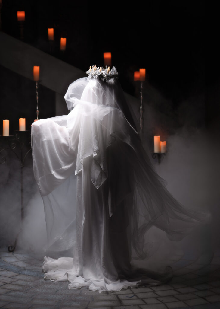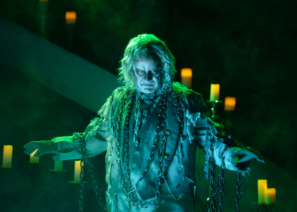 Speaking of ghosts, the special effects throughout the evening were impressive, and occasionally startling, in the best way. A chair sliding across the room with no visible assistance and a door swinging open on its own both drew audible reactions from the audience. The projections added atmosphere without feeling cheesy or distracting—a delicate balance in any production that incorporates digital elements. But the real showstopper was the ghost who hovered above the stage, floating with eerie calm. That moment alone earned a few gasps–mine included–and added a dramatic flair that complemented the storytelling without overpowering it. And of course, no Christmas Carol is complete without the Ghost of Christmas Yet to Come, who here appeared as a looming, shadowy giant. The scale and movement of that figure were genuinely ominous and lent weight to Scrooge’s most pivotal reckoning.