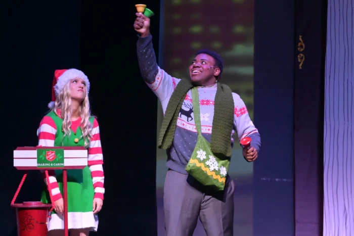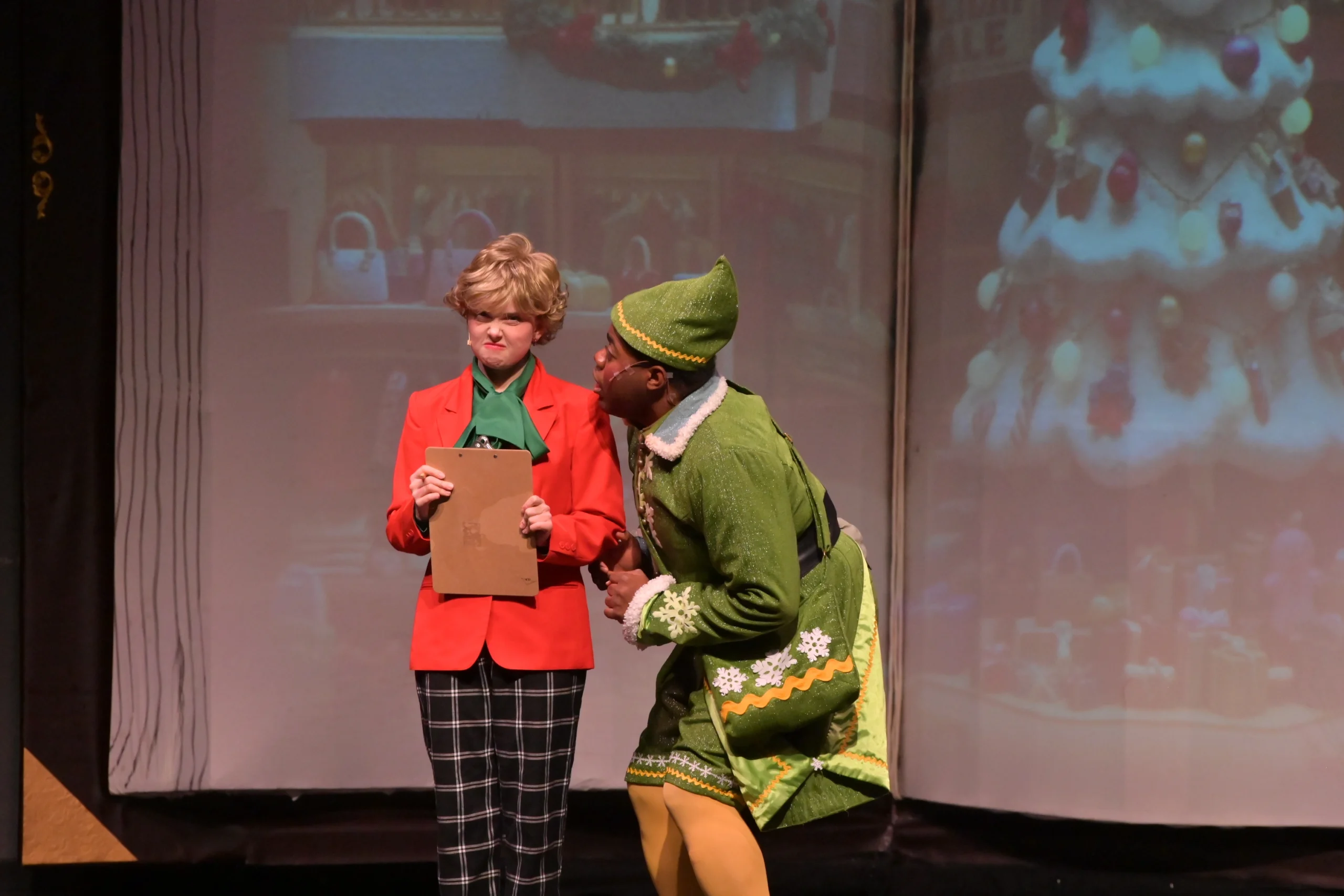 All of the principal actors in this production are really solid, especially Jovie, played by Elle Denlea. Denlea’s vocal performance is rich and compelling, and she handles Jovie’s subtle transformation from guarded to open with finesse. Her scenes with Buddy feel honest and grounded, and Jovie’s big number, “Never Fall in Love (With an Elf),” is a musical highlight of the show.