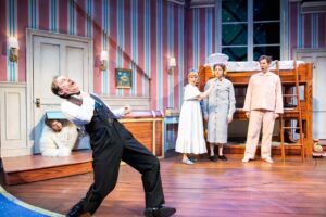 Directed by Ryan Simmons, this production is a delightful slapstick farce following a community theatre’s opening night of “Peter Pan” which quickly goes wrong until it is literally spiraling out of control. Peter Pan Goes Wrong is metatheatrical in that the story features a show within a show. The production focuses on characters who are actors with distinct personalities and background stories that influence how they portray their Peter Pan roles in the play. This added depth highlights that every production involves far more than just the script, and it’s this layered storytelling that makes the chaos even more entertaining.