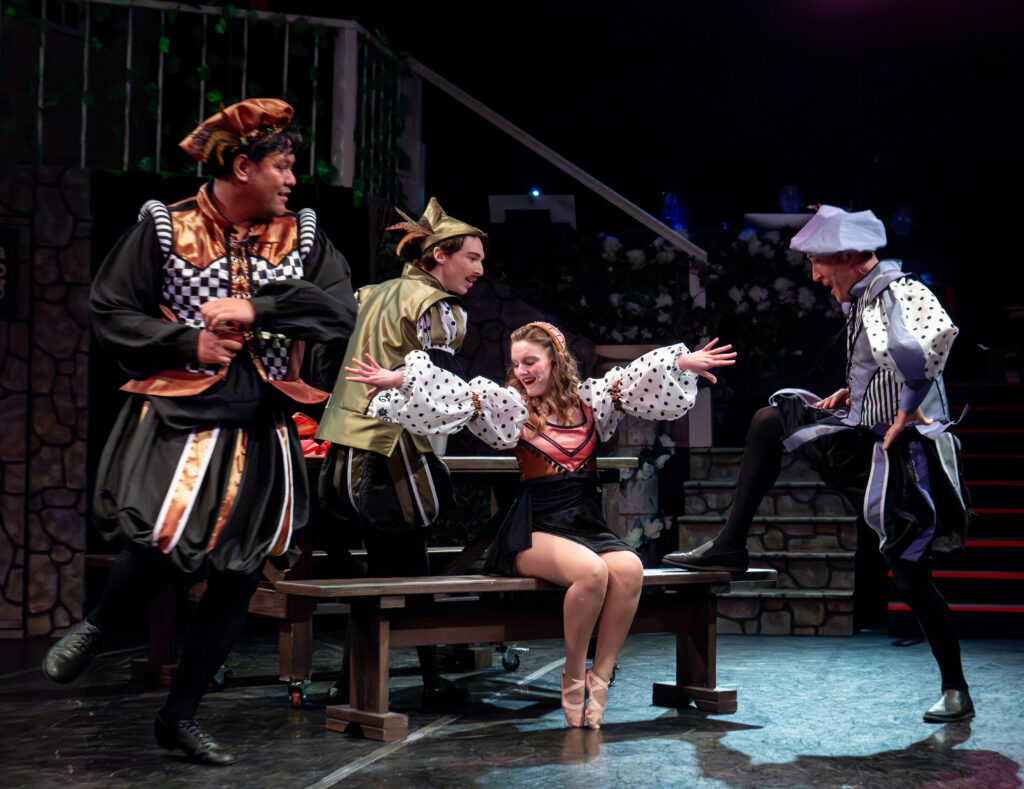 Another area in which Sanders was able to shine was in her execution of the complicated choreography on, “Tom, Dick or Harry,” as she skillfully maneuvered on a wooden bench as it was being lifted and moved about the stage. Such movements took intense concentration and effort by all four of the people in the number, which unfortunately left the vocals by Young, Azra Jackson as Gremio, and Maxwell Petralia as Hortensio sounding a little bit labored, but still impressive overall.