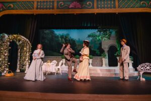 All three opulent sets designed by Tavnir Carey are impressive for a community theatre production. The indoor sets feature lofty windows with lavish dressings and marbled flooring. The outdoor set features a large flowering arbor, and all have a depth created by layering views beyond the playing space down front. Credit goes to Set Dresser and Props Designer Robyn Rausher-Fellows for the flowering arbor, delicate furniture, a classic gramophone and even what appears to be a gorgeous, antique, square grand piano—which gets its own comic moment when Brooks Bedore as Algernon plays, underscoring his own lines. Sandy Arts is fortunate to have a talented and experienced Charge Artist, Maria Brown Fredickson, on board. Her work is showcased in the beautifully painted false proscenium and an enormous, full stage backdrop depicting the green rolling hills of the country estate.