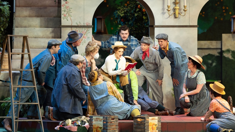 Orange groves permeate the set by designer Jaime Mejia, and the townsfolk are portrayed as orchard workers, wearing overalls and protective hats (the costume designer was Angela M. Kahler). Adina looked positively fetching in Act I with jodhpurs and a while blouse and blue scarf — and the military men’s dark khaki uniforms were appealing.