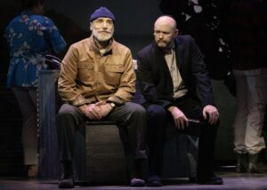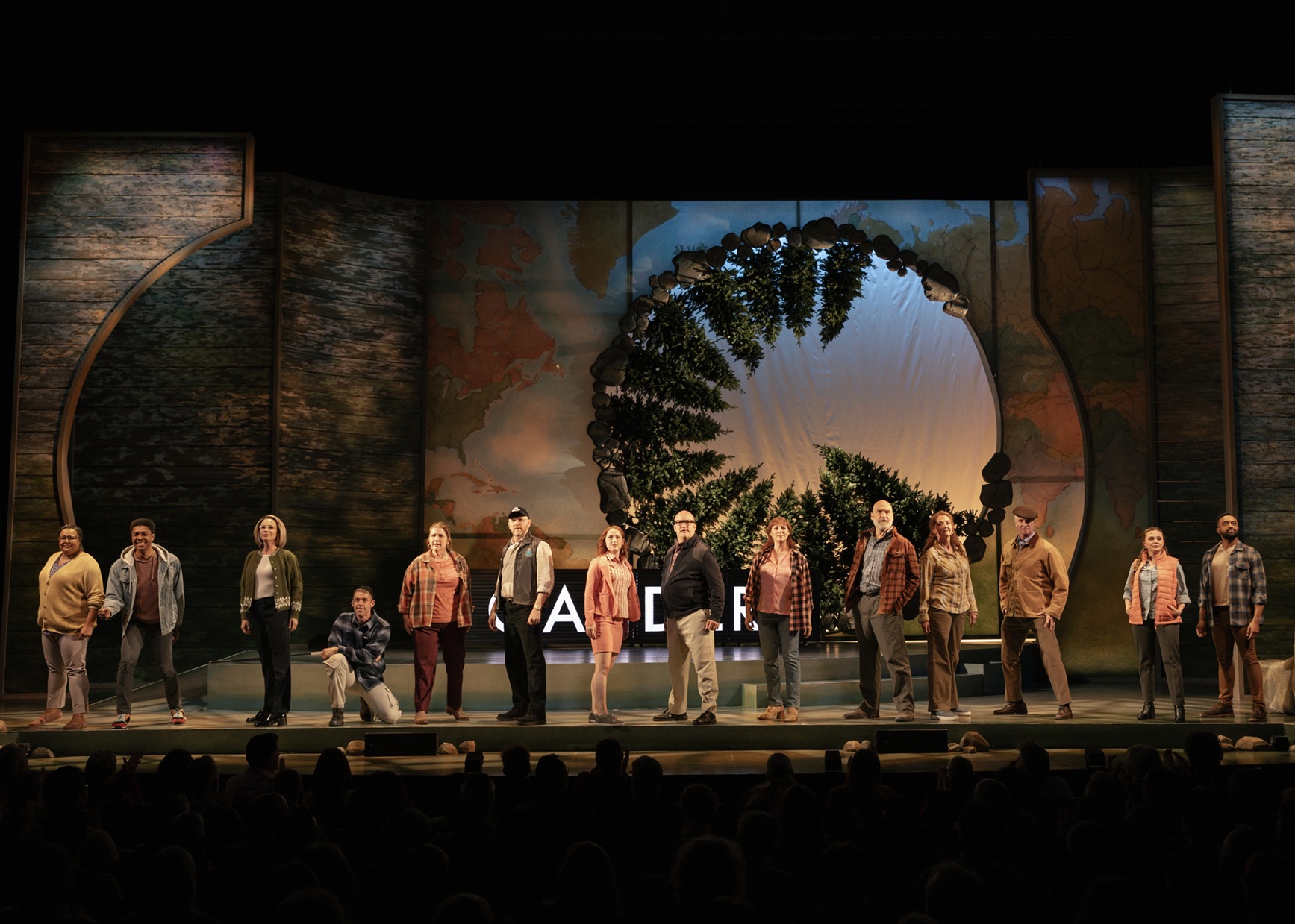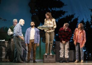 Visually, the production embraces simplicity with intention. Scenic designer, Jo Winiarski, creates a flexible space within a forest theme, anchored by a unique circular design of pine trees, reinforcing themes of unity. The world map backdrop subtly underscores the global scope of the story, while versatile set pieces enable seamless transitions. Costume designer, Patrick Holt, cleverly illustrates the transformation of the “plane people,” whose mismatched donated clothing becomes a visual symbol of both displacement and care. Lighting design by Jose Santiago adds warmth and texture, with especially enjoyable soft sunrise hues and shifting tones marking the passage of time.